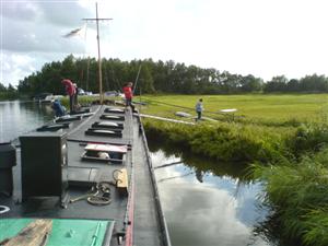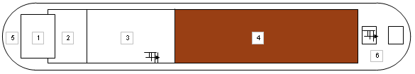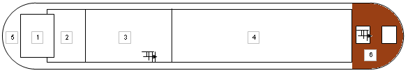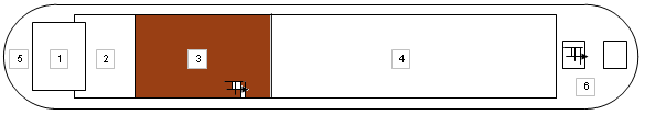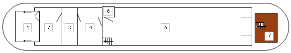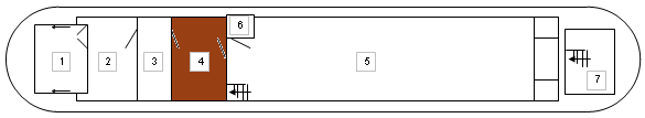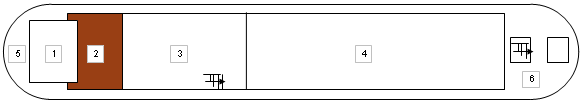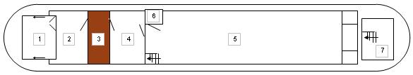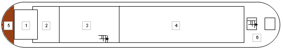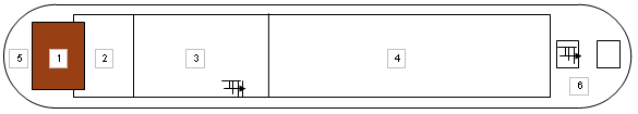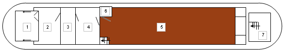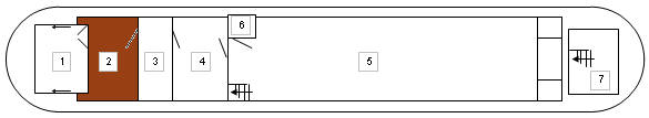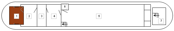 Rondleiding Het Schip Beschrijving van het Schip Interieur 1. Stuurhut 2. Roef 3. Machinekamer 4. Kombuis 5. Ruim 6. WC 7. Vooronder Interieur 1. Wheelhouse 2. Robbery cover 3. Black cover (steel) 4. Slatted deck 5. aft deck 6. Foredeck Het Schip Beschrijving van het Schip